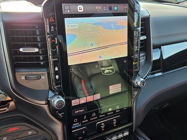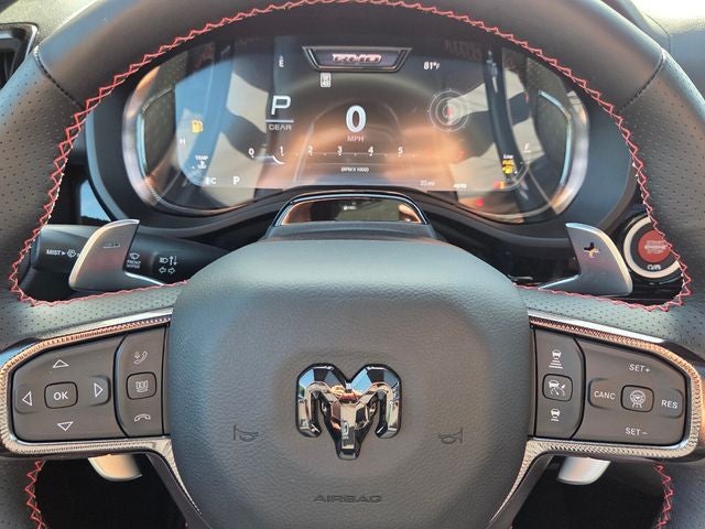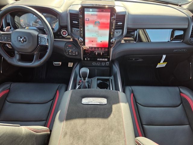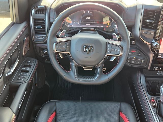 10 Speakers, 12-Way/1-Way Trailer Connector, 14.4 Touchscreen Display, 240 Amp Alternator, 3.92 Rear Axle Ratio, 4-Wheel Disc Brakes, 4G LTE Wi-Fi Hot Spot, ABS brakes, Adaptive suspension, Adjustable pedals, Air Conditioning, Alloy wheels, AM/FM radio, Apple CarPlay/Android Auto, Auto High-beam Headlights, Auto Power-Folding Mirrors, Auto-dimming door mirrors, Auto-Dimming Exterior Driver Mirror, Auto-dimming Rear-View mirror, Automatic temperature control, Brake assist, Compass, Connected Travel and Traffic Services, Connectivity - US/Canada, Delay-off headlights, Disassociated Touchscreen Display, Dome Dual LED Reading Lamp, Driver door bin, Driver Power Seat Back Massage, Driver Seat Memory, Driver vanity mirror, Driver/Passenger Wrapped Assist Handles, Drowsy Driver Detection, Dual front impact airbags, Dual front side impact airbags, Dual Wireless Charging Pad, Dual-Pane Panoramic Sunroof, Electronic Stability Control, Evasive Steer Assist, Exterior Mirrors Courtesy Lamps, Exterior Mirrors with Heating Element, Exterior Mirrors with Memory, Exterior Mirrors with Supplemental Signals, Exterior Parking Camera Rear, Flareside Box, Front anti-roll bar, Front Bucket Seats, Front Center Armrest w/Storage, Front dual zone A/C, Front fog lights, Front License Plate Bracket, Front Passenger Interactive Display, Front Passenger Power Seat Back Massage, Front reading lights, Front wheel independent suspension, Full Length Premium Upgraded Floor Console, Fully automatic headlights, Garage door transmitter, GPS Navigation, Hands-Free Active Driving Assist System, Harman/Kardon 19 Speaker Premium Sound, HD Radio, Heads-Up Display, Heated door mirrors, Heated front seats, Heated Second Row Seats, Heated steering wheel, Illuminated entry, Integrated Center Stack Radio, Integrated Voice Command with Bluetooth®, Intersection Collision Assist System, Leather Shift Knob, Leather steering wheel, Leather Trimmed Bucket Seats, Leather/Carbon Flat-Bottom Steering Wheel, LED CHMSL Lamp, Low tire pressure warning, Luxury Front Door Trim Panel, MOPAR Off-Road Style Running Boards, MyFlexCare Service Plan, Navigation System, Occupant sensing airbag, Outside temperature display, Overhead airbag, Overhead console, Panic alarm, Passenger door bin, Passenger vanity mirror, Power Adjustable Pedals with Memory, Power door mirrors, Power driver seat, Power passenger seat, Power steering, Power Tailgate, Power windows, Premium Wrapped Instrument Panel Bezel, Quick Order Package 22Y RHO, Radio data system, Radio: Uconnect 5 Nav with 14.4 Display, Radio: Uconnect 5 Navigation with 12.0 Display, Radio/Driver Seat/Mirrors/Pedals Memory, Rain Sensitive Windshield Wipers, Real Carbon Fiber Interior Accents, Rear 60/40 Folding Split Recline Seat, Rear reading lights, Rear seat center armrest, Rear step bumper, Rear window defroster, Red Interior Accents, Remote keyless entry, RHO Level 1 Equipment Group, Security system, SiriusXM Radio Service, Smartphone as a Key Capable, Speed control, Split folding rear seat, Sport steering wheel, Steering wheel mounted audio controls, Surround View Camera System, Tachometer, Telescoping steering wheel, Tilt steering wheel, Traction control, Traffic Sign Recognition, Trip computer, Turn signal indicator mirrors, USB Host Flip, Variably intermittent wipers, Ventilated Front Seats, Ventilated Rear Seats, Voltmeter, Wheels: 18 x 9 Black Paint/Polish Aluminum. Diamond Black Crystal Pearlcoat 2026 Ram 1500 RHO 4WD 8-Speed Automatic 3.0L I6